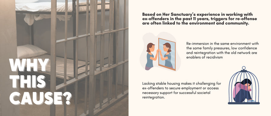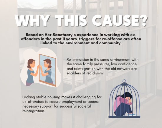 Her Sanctuary is an organization that is committed to help reduce the recidivism rate of ex female prisoners in Singapore. This is achieved through building a halfway house dedicated to implementing a holistic approach that complements existing rehabilitation efforts by addressing multiple aspects of the individual's life.